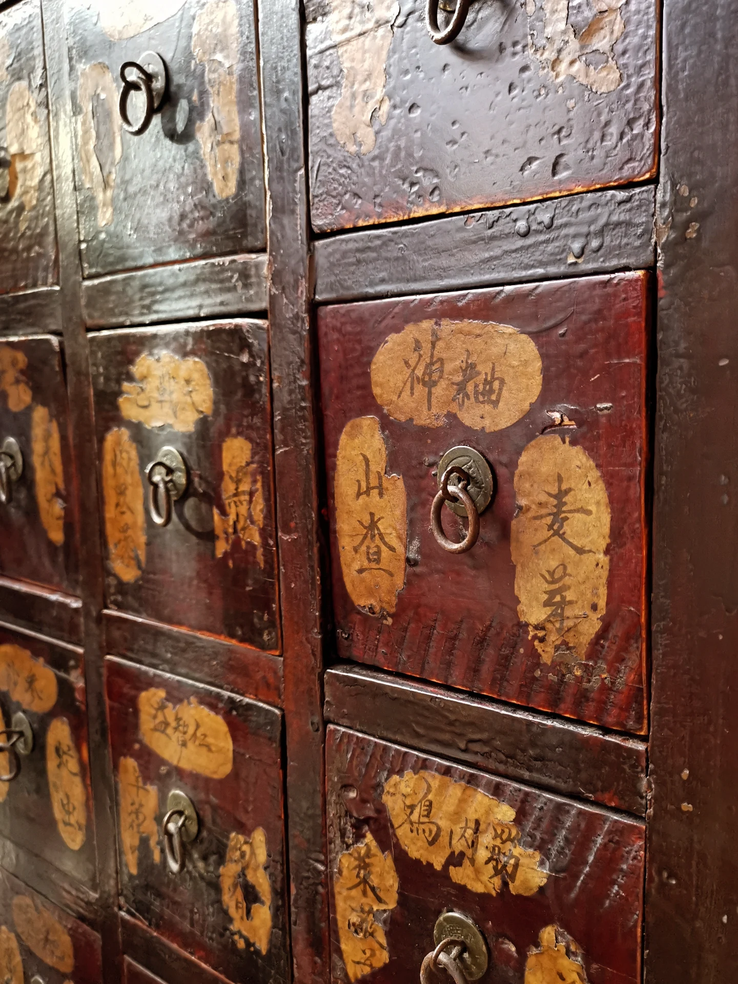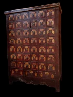 A totally charming traditional oriental handpainted hardwood apothecary/spice cabinet in terrific overall condition.