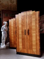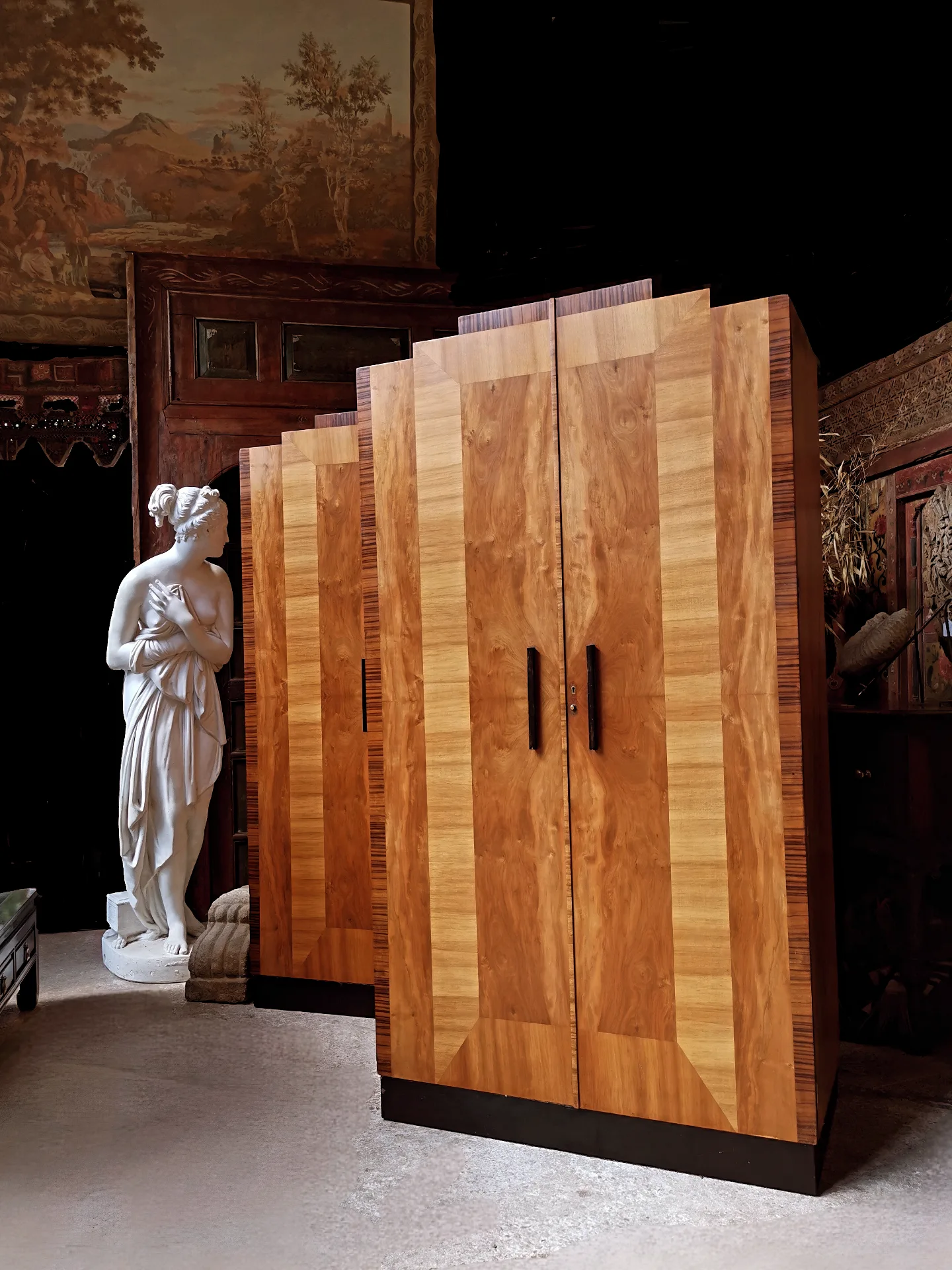 A pair of exceptional Art Deco walnut wardrobes, one with hanging and one a fitted interior.