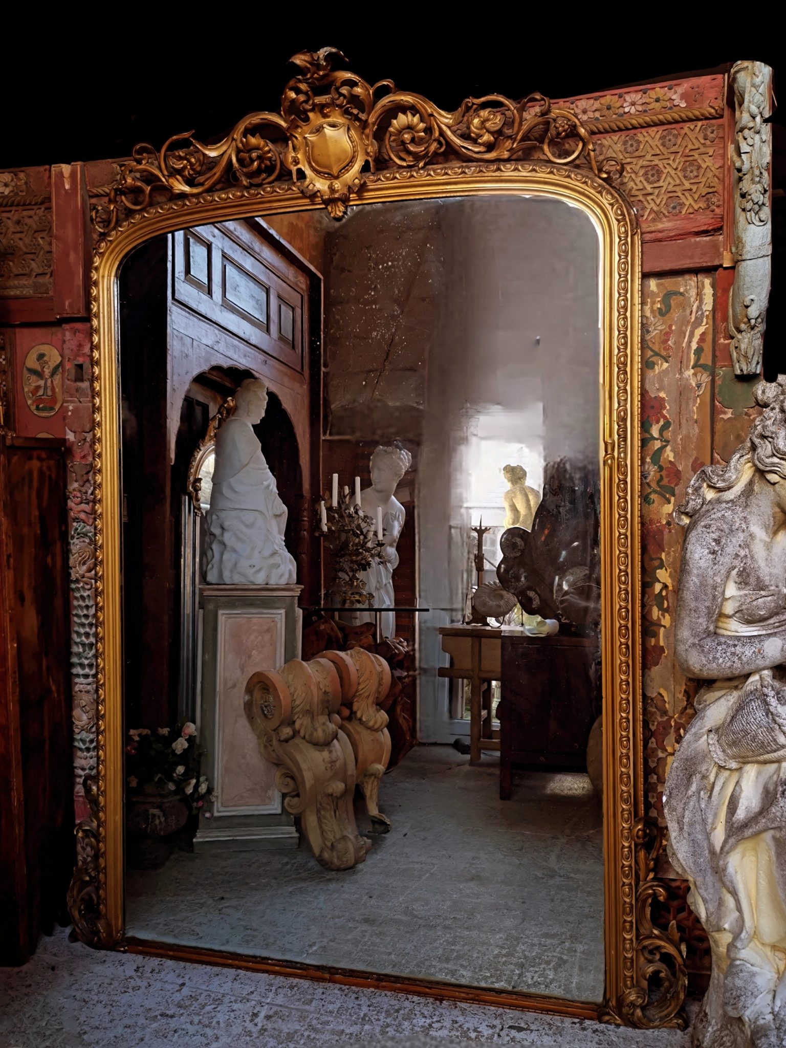 A quite totally gorgeous 19th century English overmantle mirror measuring 8ft x 6ft with original glass plate and panelled back.
