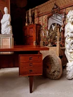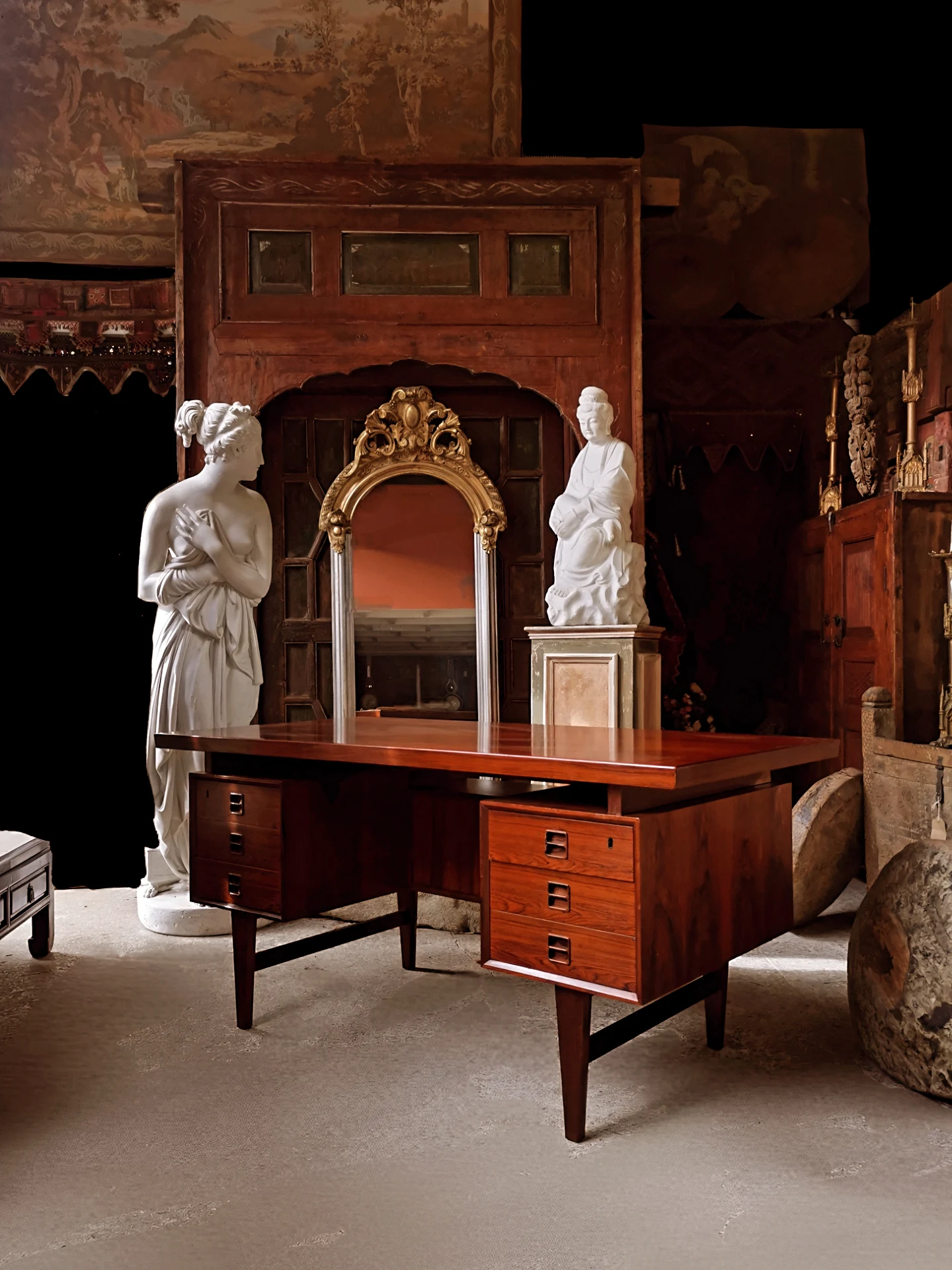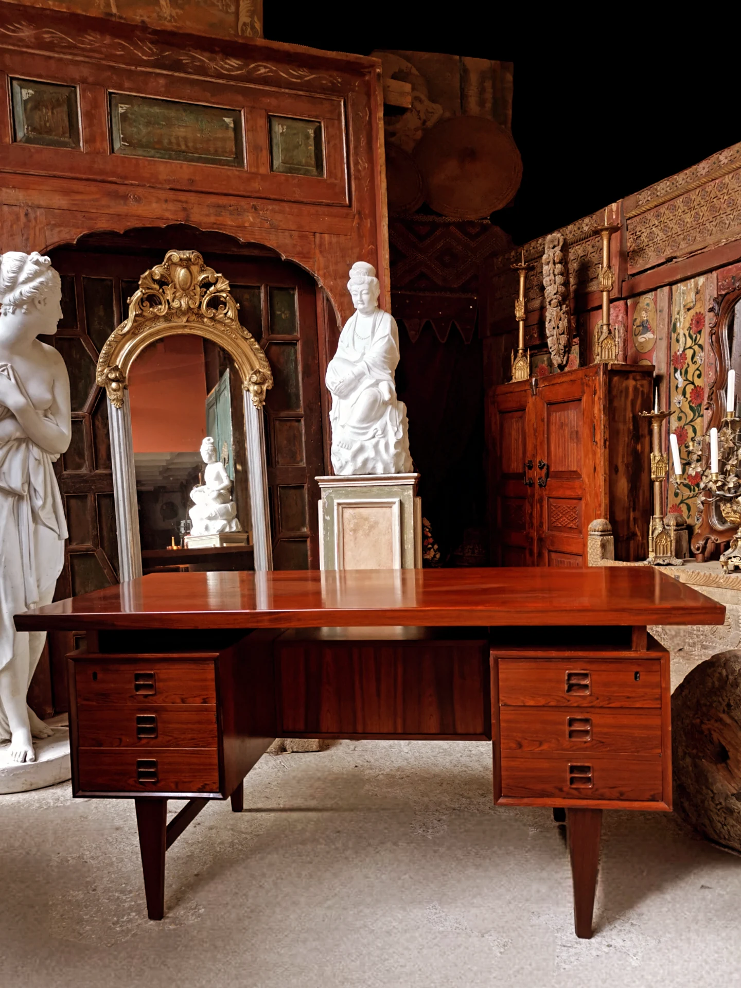 A glorious Kai Kristiansen 1960s rosewood desk measuring 150 x 75 cms. Pedestal drawers to front, bookcase to rear.