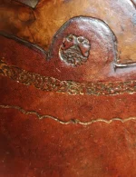 A quality 19th century estate owned carved walnut library/centre/stretcher table retaining the beautiful original tooled leather top and drawers to both sides.