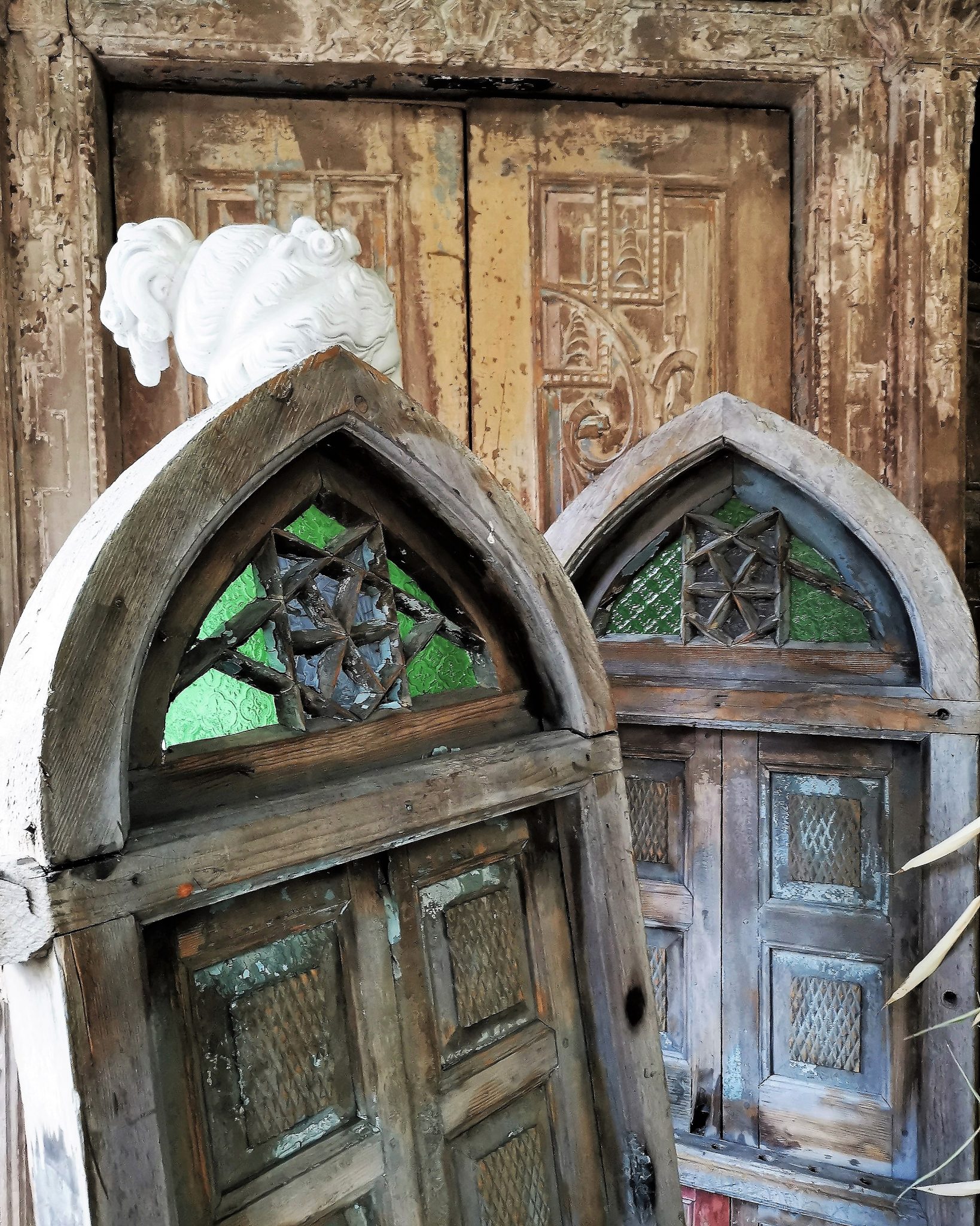 A truly beautiful pair of 19th century carved Guajarati Shutter Windows with stained glass panels in the original paint.