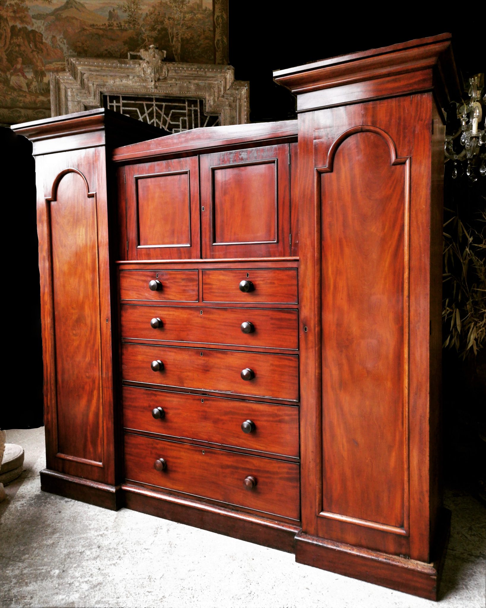 An exceptionally handsome and wonderful quality 19th century mahogany gentlemans compactum/wardrobe. Twin towers of hanging space which include an inner drawer, peg rails and brushing slides with a cupboard and graduated drawers to centre. Completely disassembles for ease of movement/transportation. 214 wide x 210 high x 61 deep